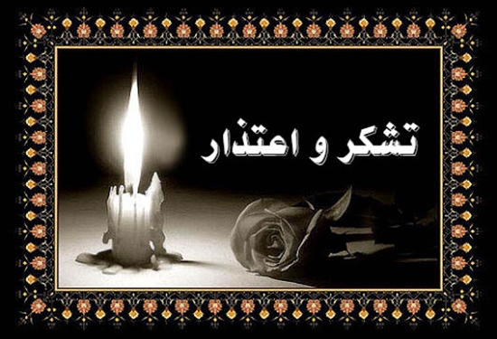 به رسم ادب و ادای احترام، بر خود لازم و واجب میدانم که از ابراز همدردی و محبت همه عزیزانی  که با حضور در مراسم تشییع، تدفین، ترحیم و چهلمین روز درگذشت فرزند دلبندم  و یا با ارسال پیام تسلیت، تماس تلفنی، تاج گل و بنر موجب تسلی خاطر اینجانب گردید، تشکر و قدردانی نمایم.