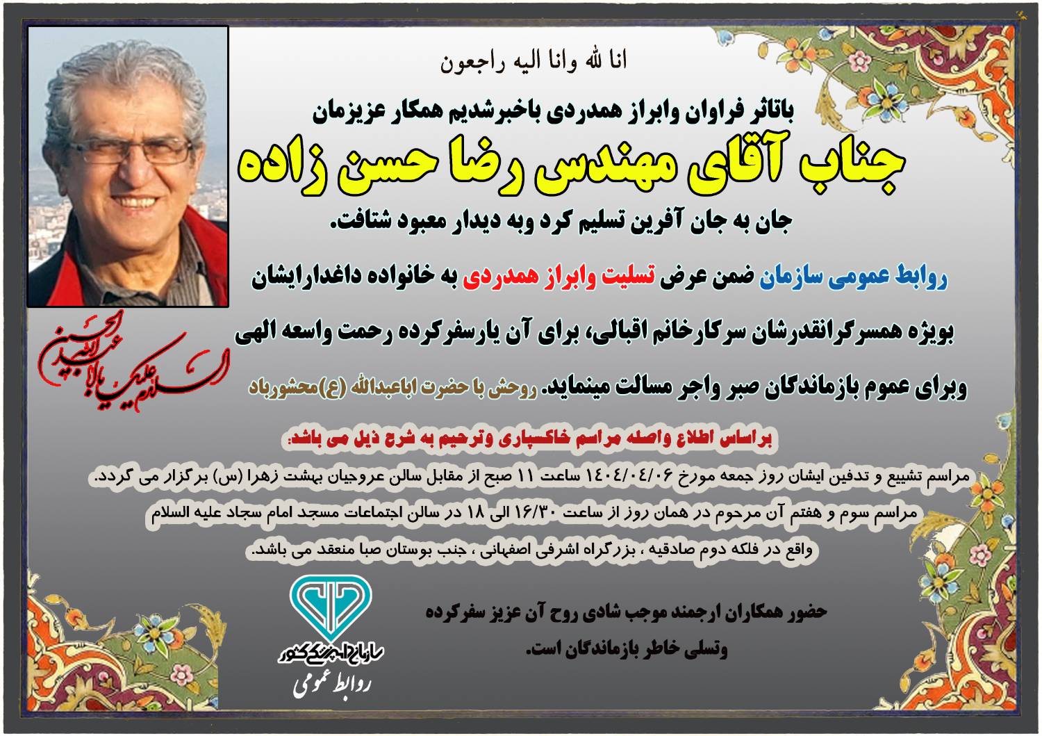 تسلیت درگذشت همکار عزیزمان مهندس رضا حسن زاده کپی لینک کوتاه گروه خبری: اخبار داخلی کد خبر : 340892 کلمات کلیدی