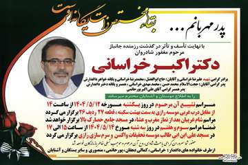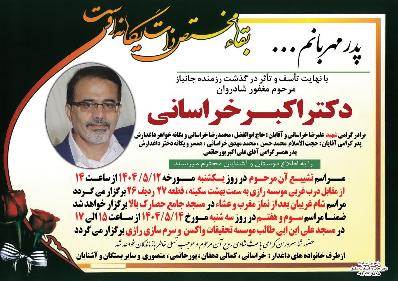 با نهایت تأسف و تأثر درگذشت زنده یاد دکتر اکبر خراسانی عضو هئیت علمی و از محققان برجسته موسسه تحقیقات واکسن و سرم سازی رازی که عمر شریف خویش را در خدمتگزاری به کشور سپری نمودند، به خانواده محترم ایشان و جامعه علمی کشور به ویژه خانواده بزرگ دامپزشکی کشور و موسسه تحقیقات واکسن و سرم سازی رازی تسلیت و تعزیت عرض می نمایم.