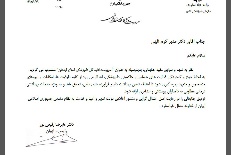 در متن حکم که به امضای رییس سازمان دامپزشکی کشور رسیده و در آغاز آن تاکید شده این انتصاب با نظر به تعهد و سوابق مفید نامبرده صورت گرفته، آمده است: ' به لحاظ تنوع و گستردگی فعالیت های حساس و حاکمیتی دامپزشکی، انتظار می رود از کلیه ظرفیت ها، امکانات و نیروهای متخصص و متعهد بهره گیری شود تا اهداف تامین بهداشت دام و فرآورده های دامی، تحقق یابد و به ویژه خدمات بهداشتی درمانی مطلوبی به دامداران روستایی و عشایری ارائه شود.'